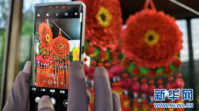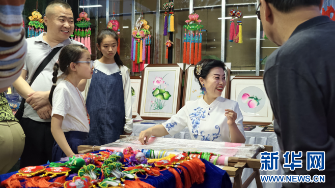 “青绣”非遗传承人单永武为市民展示河湟刺绣技艺。