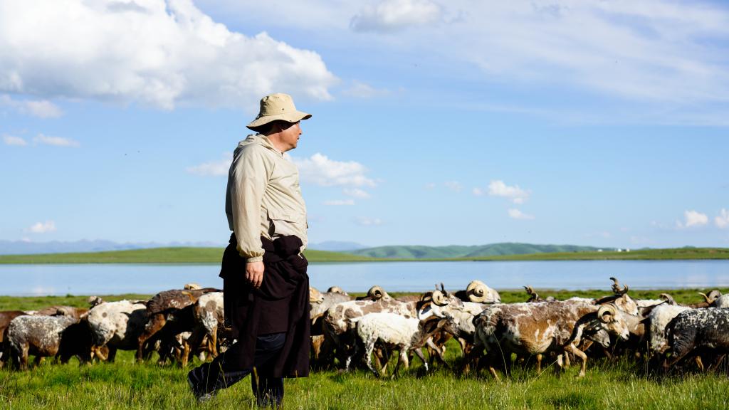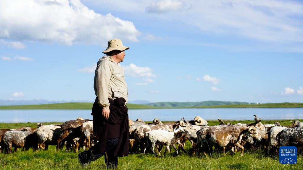 夏日,青海省黄南藏族自治州泽库县境内水草丰饶,草原、蓝天、牛羊构成别致的美景。泽库县平均海拔3700米,2022年入选全国草原畜牧业转型升级试点县。